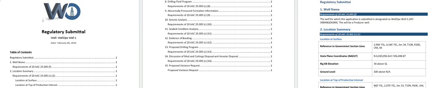 Regulator-ready drilling permit and revision packages generated from structured engineering inputs—consistent, auditable, and defensible.