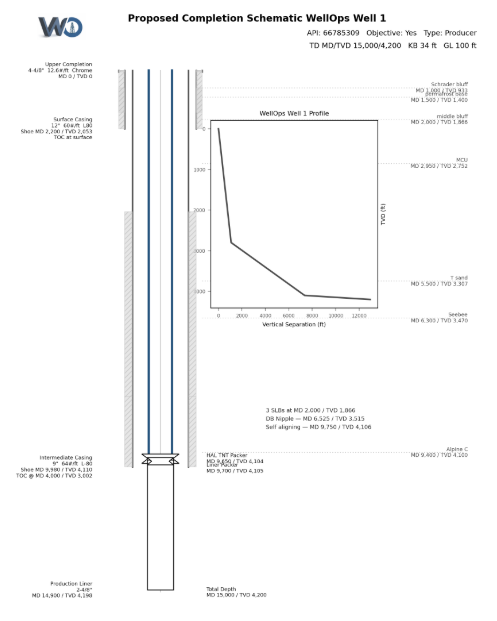 Wellbore, casing, cement, and BOP schematics rendered deterministically from inputs—no manual drafting, no visual drift between wells.